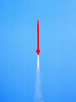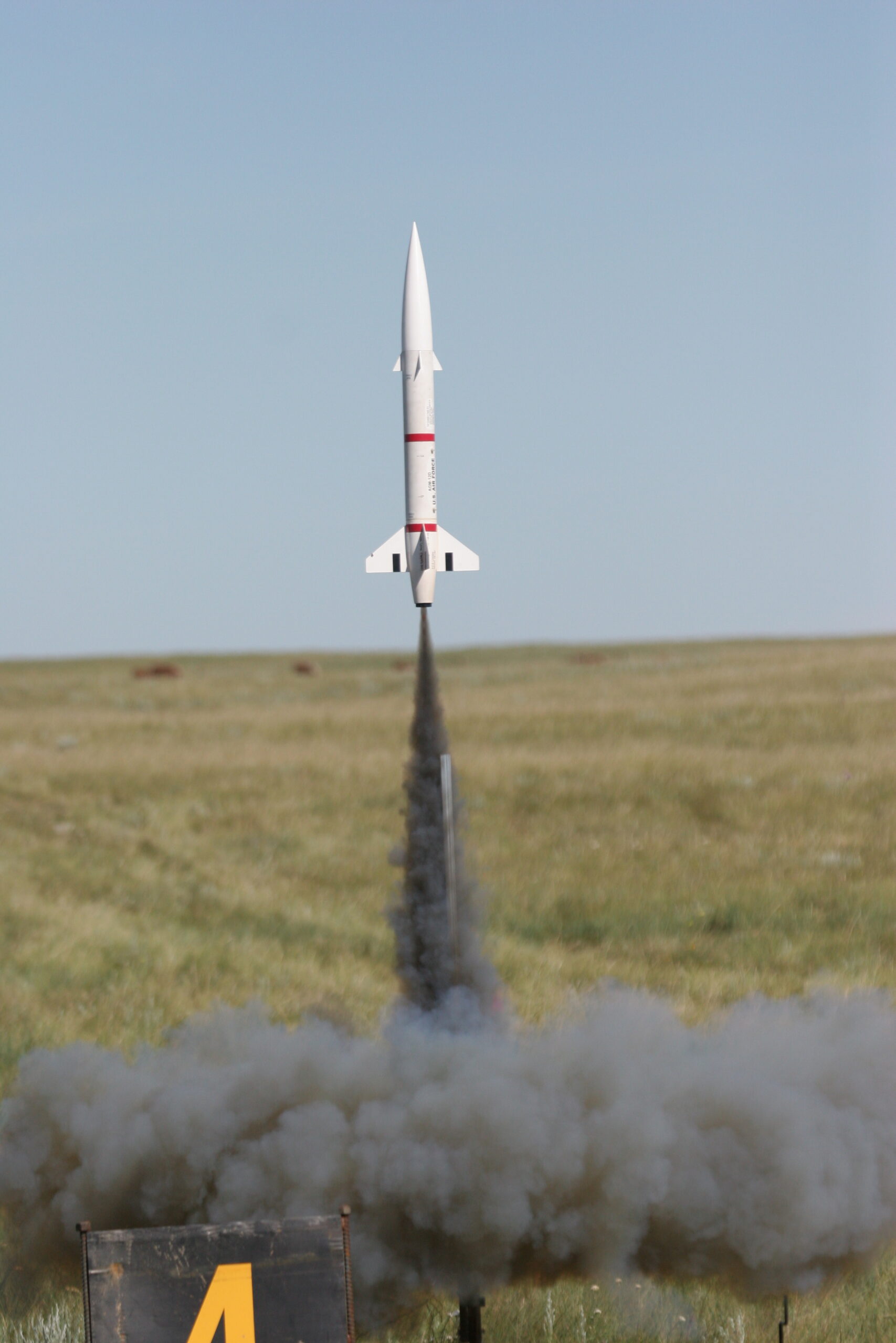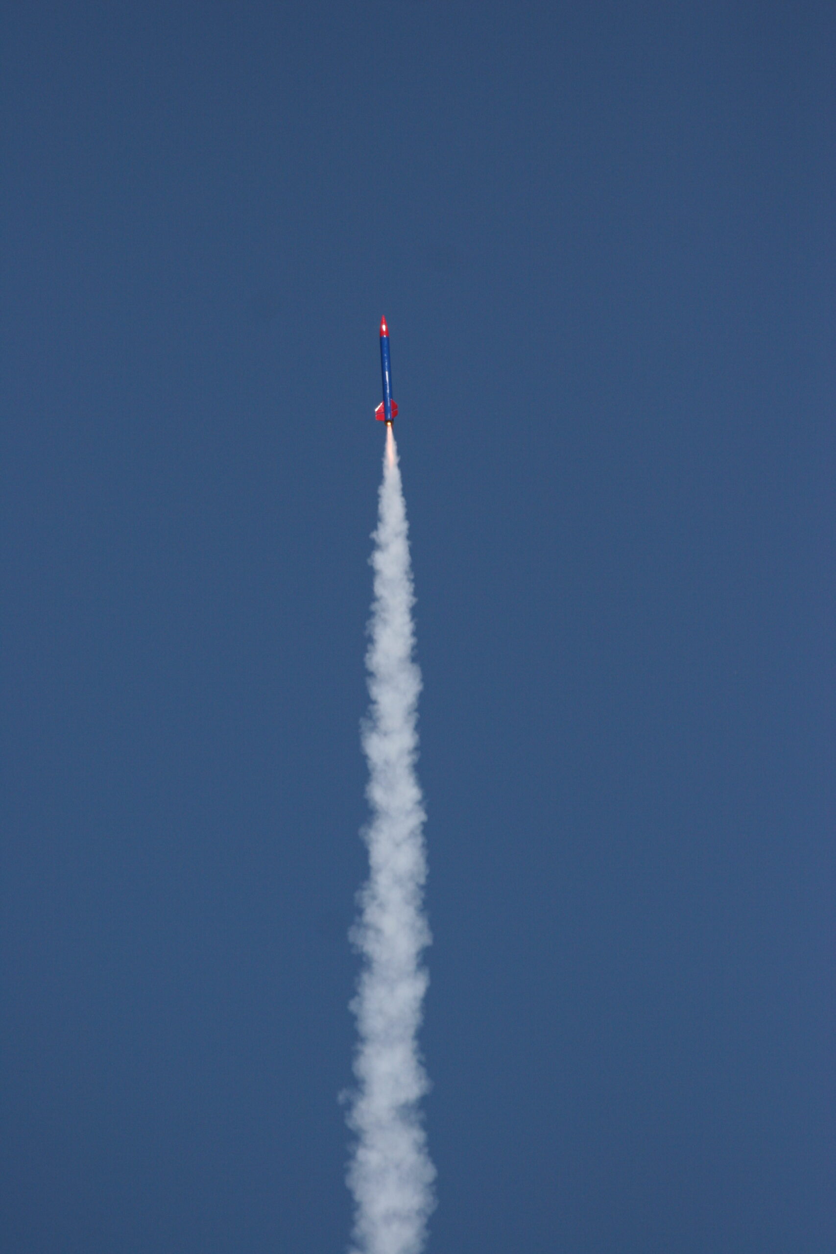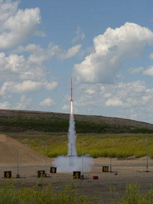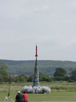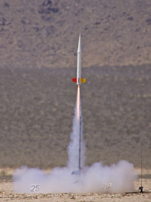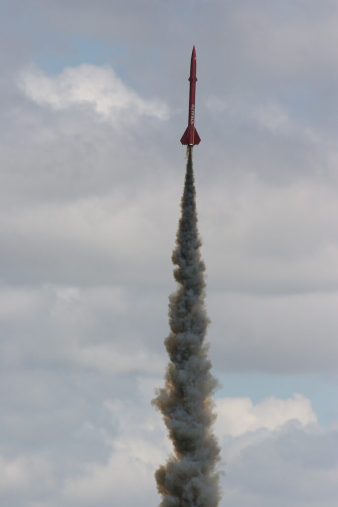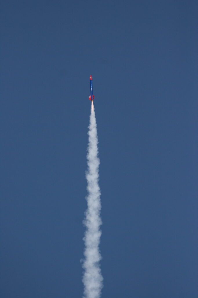 Dave Morey’s rather coloful Colossal Crayon two stage rocket lifting off under the power of a Pro38 J330.