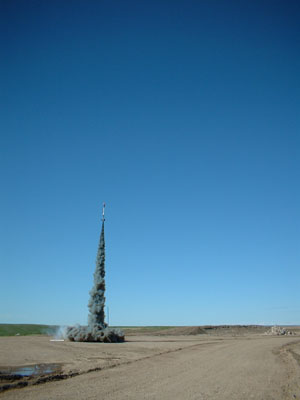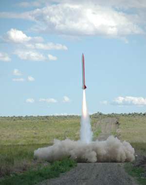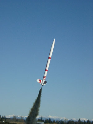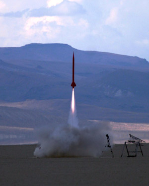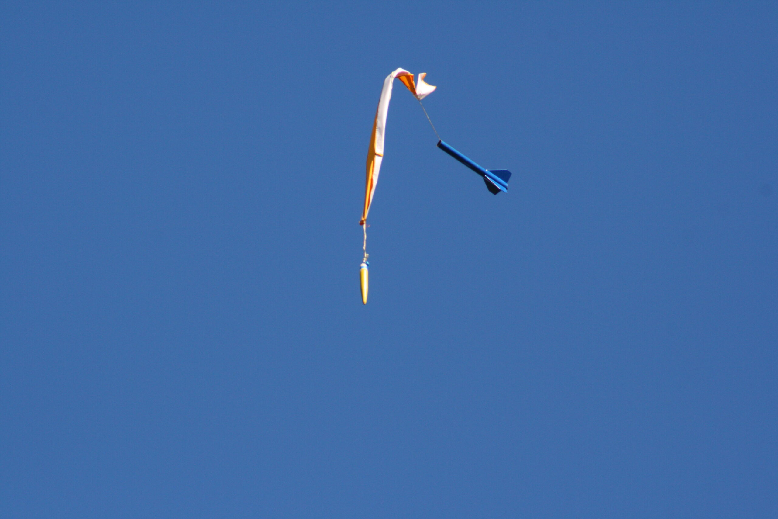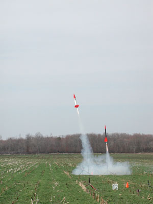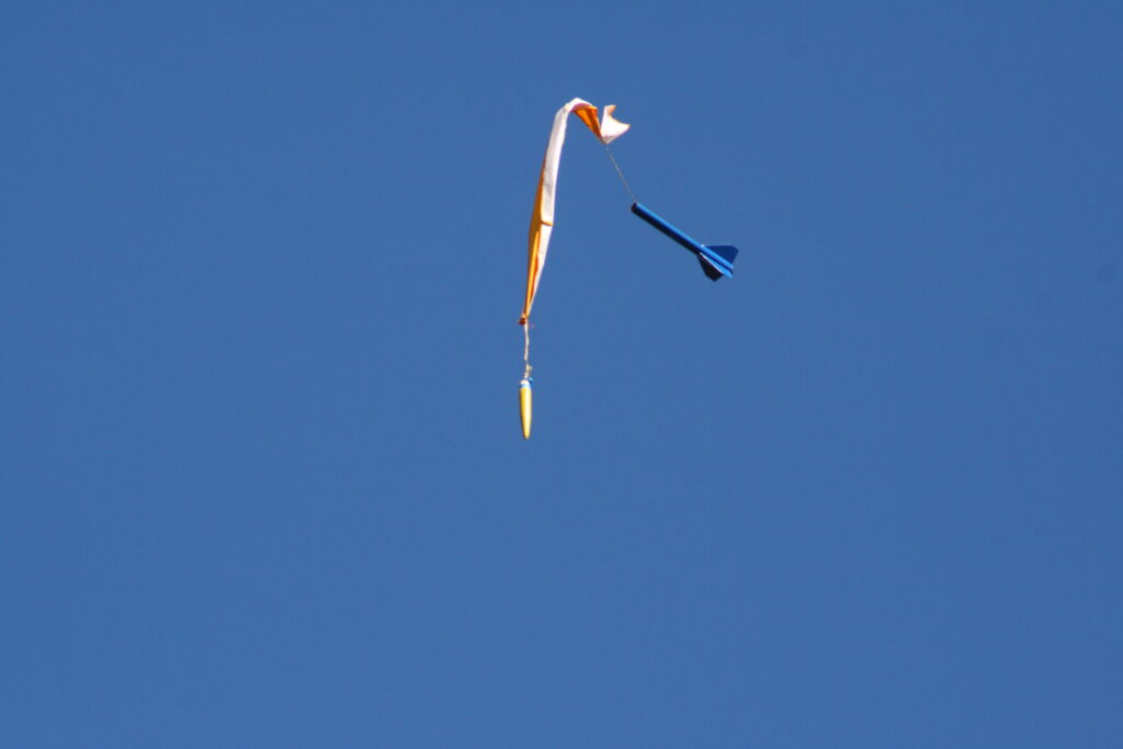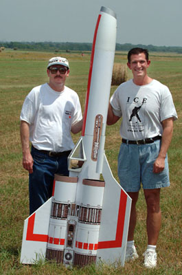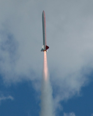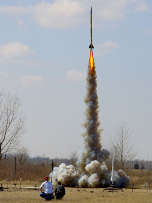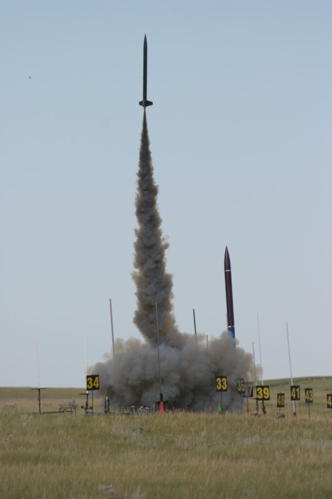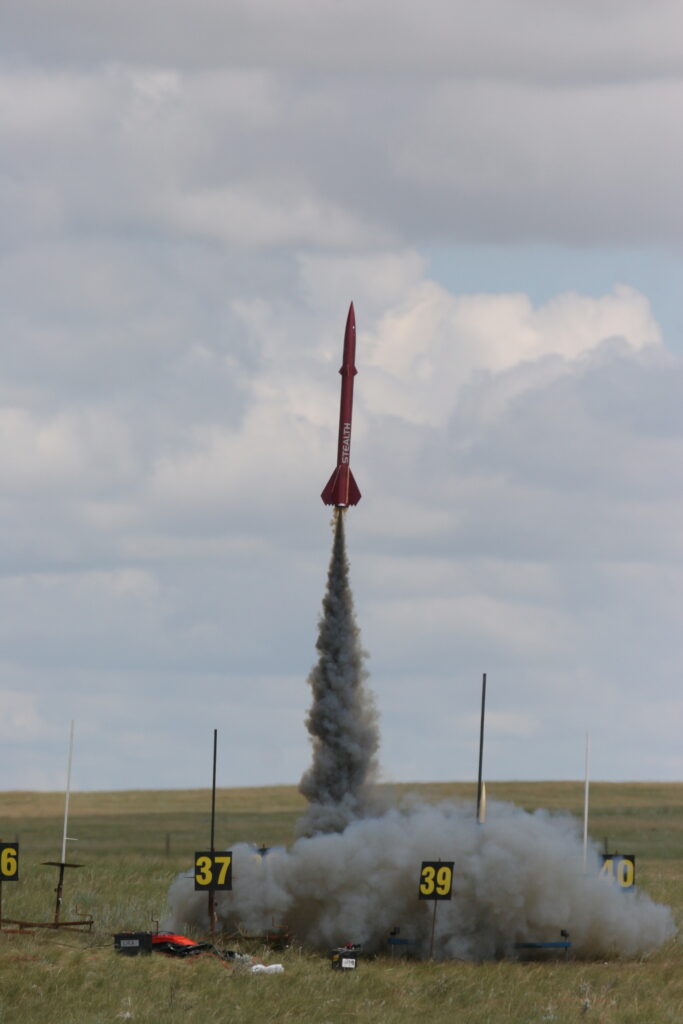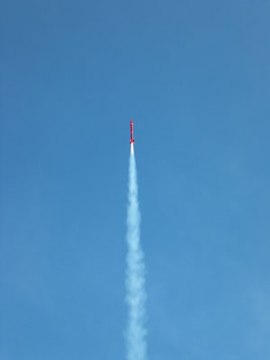 Dave Morey’s rather coloful Colossal Crayon two stage rocket lifting off under the power of a Pro38 J330.